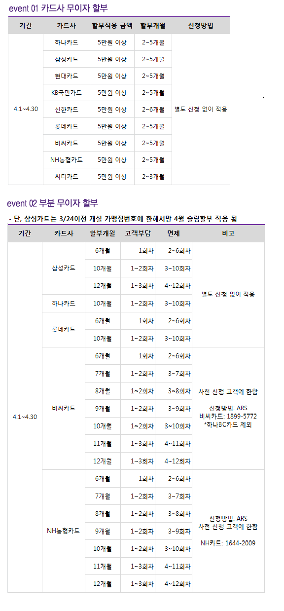 2017년 4월 카드사 무이자 할부 이벤트 안내